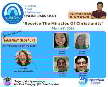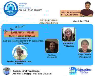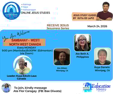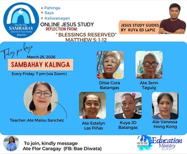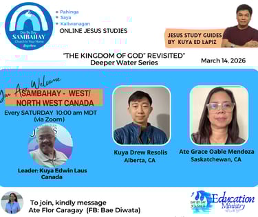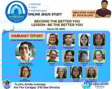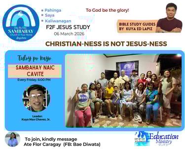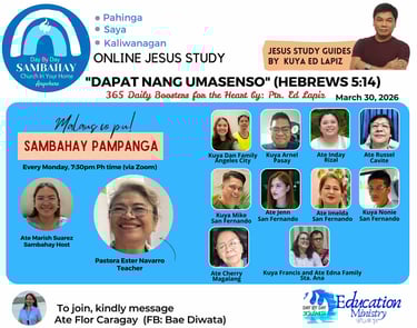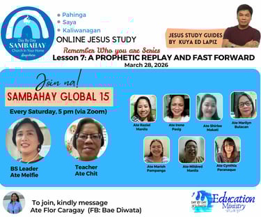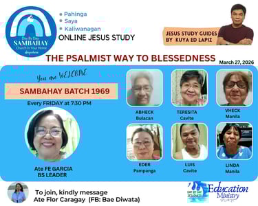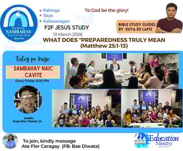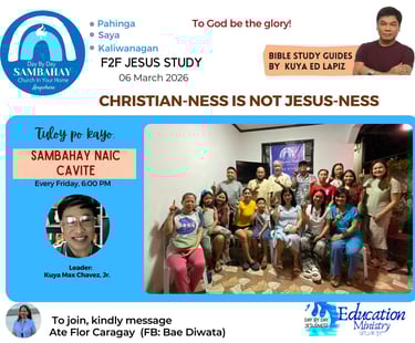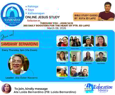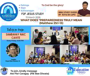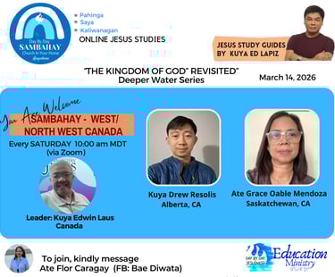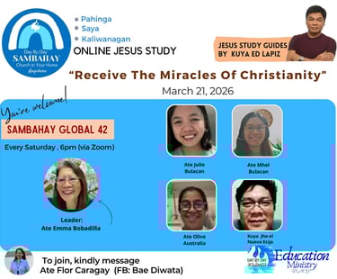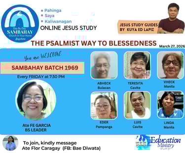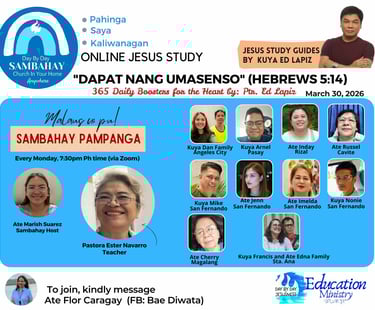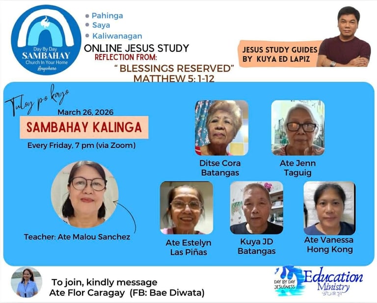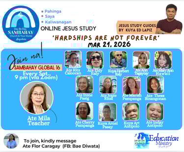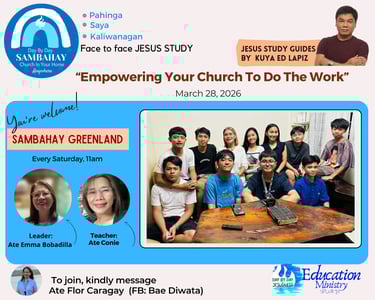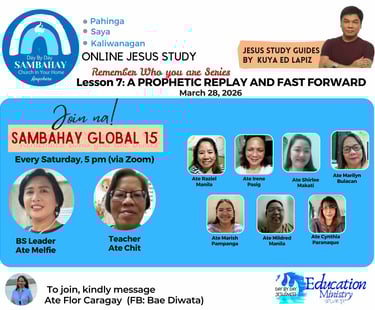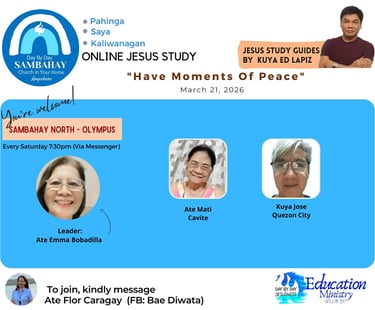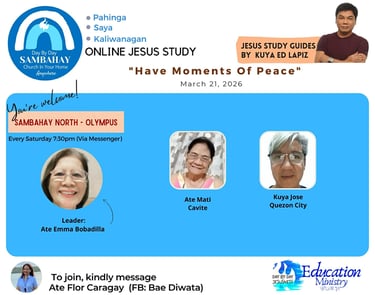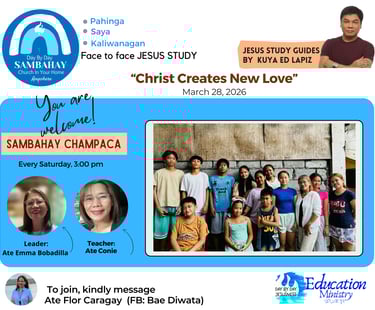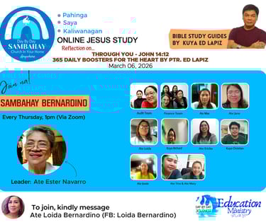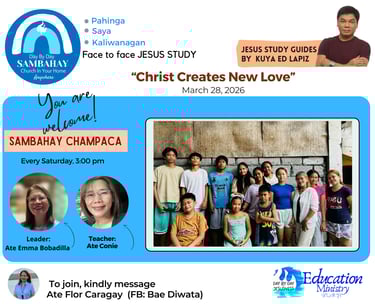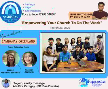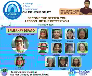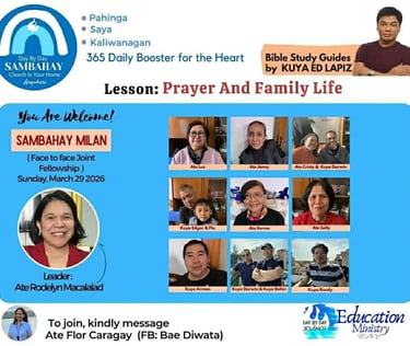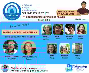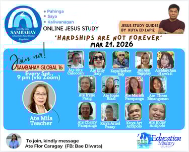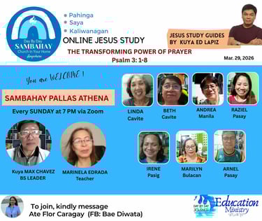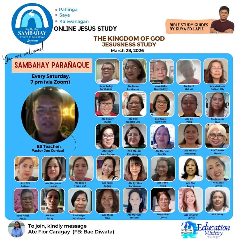 Sambahay aims to care for, encourage, and help believers find rest, peace, joy, enlightenment and growth in the grace and knowledge of our Lord Jesus in a smalls scale in person and online gathering using study guide designed by Tito Ed Lapiz.